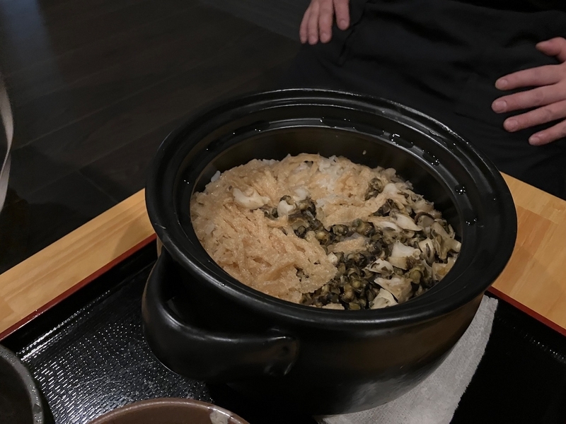 締めのご飯も五島の方、本土の方、お客さんの様子を見ながら、献立に入れ込んでくる。5人で伺った際には、たっぷりのミナ(五円玉でパチンとてっぺんを落とす、ウミニナ)の炊き込みご飯でした。